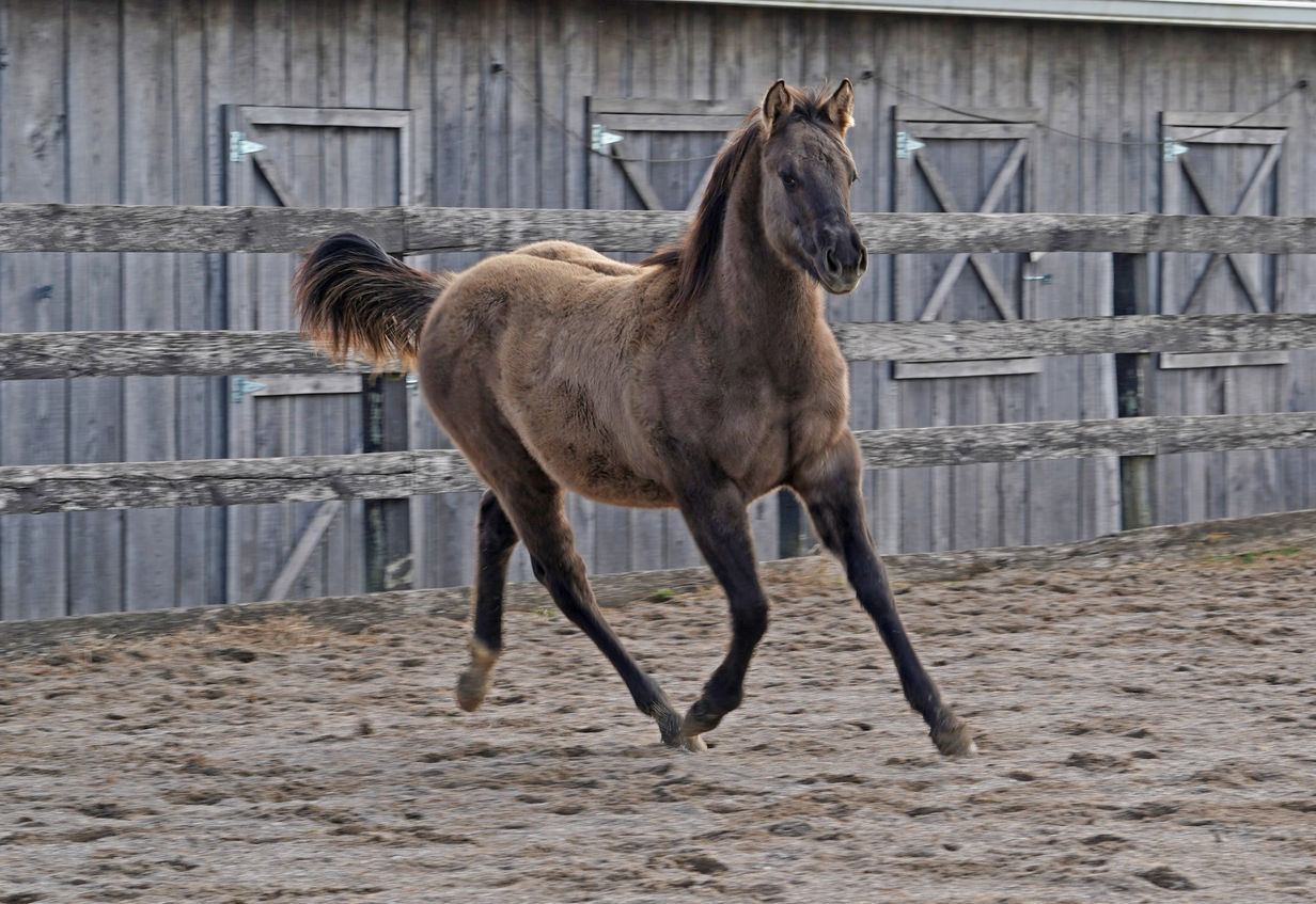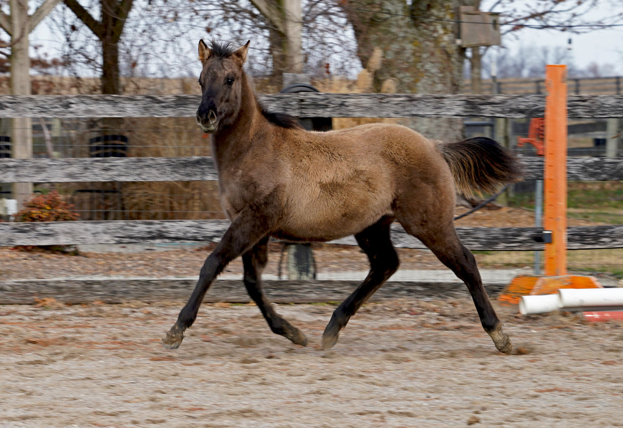 Highly competitive performance prospect out of our big, stout, platinum grulla mare! Super balanced conformation, correct limbs, fantastic hind leg and shoulder angles. This elegant girl will have some size. She is light on her feet and tracks up nicely. Uphill, cadenced movement will make her a high level dressage and ranch versatility prospect. Should mature to 15.0-15.1 hands.
